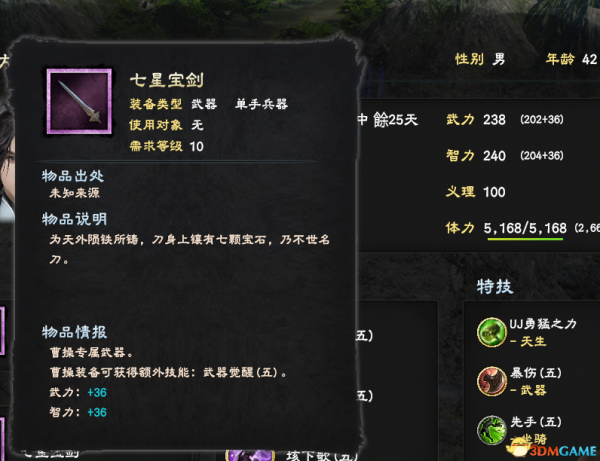 再说明一点:武器额外技能觉醒会无效,但是武器自带的属性和特技有效。饰品自带的特技也有效。如下图,武力智力+36激活,武器特技暴伤激活。