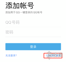 如果在同一设备需要登录其他平台,此时手机QQ已经登录,那么在添加帐号页面,点击“扫码授权登录”按钮,进入二维码页面扫码进行授权即可。