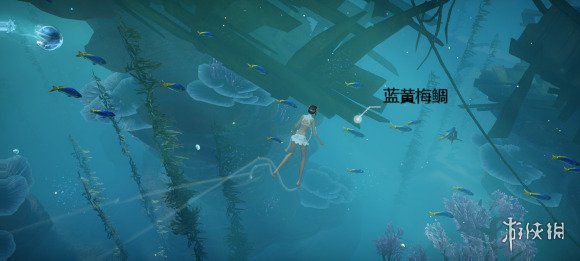 成群结队呈线状从幽光鲸落一直环绕沉船,位于水面上层。蓝黄色非常显眼。