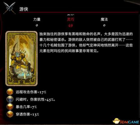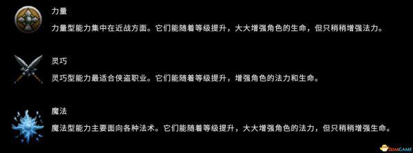 你的角色可以向力量、灵巧、魔法三个方向发展。