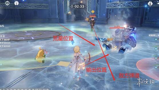 下图是深渊实战的一个场景,这里需要输出倒下的冰胖,但自身血量不多,需要顾及到岩法师。这时荒星的位置就有说法了。笔者选择是在【自身的输出位】与【敌方】的连线上,同时外圈能够覆盖到【输出目标】。