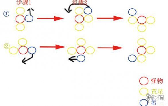 如下图所示,开始的阵型①和②都是实战中很好做出来的(步骤1),接下来只要在离自身最近的那个位置放上第三个荒星(步骤2),这个阵型就完成了。接下来每一次将荒星放至缺口上,都将有二段伤害。