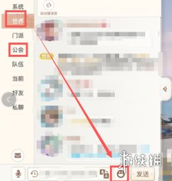 2.弹出频道面板后,选择【世界频道】或者【公会频道】,并点击底部对话框旁边的表情图标