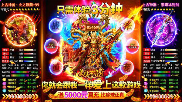【美杜莎传奇】中天机老人送祝福,白送5000元充值卡,充值卡升级无限合成!上线赠送VIP30,100000钻石,100W元宝,登录送冰龙神兽,5分钟送白虎神兽,30级送火龙神兽,冰火两重天,神兽在线就能铺捉,收集神兽抢先兑换2千万钻石,独创一秒5刀,神龙降临,装备永久保值,钻石无限回收!