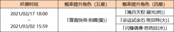 ●活动期间,四星角色「掩月天权·凝光(岩)」「命运试金石·班尼特(火)」「闪耀偶像·芭芭拉(水)」的祈愿获取概率将大幅提升!