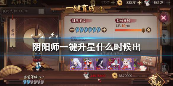 阴阳师一键升星什么时候出?一键升星是阴阳师玩家最期待的功能,可以说是万众期待。这次游戏体验服终于出了一个一键育成功能,那么这个一键升星功能究竟什么时候才能上线正式服呢?