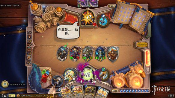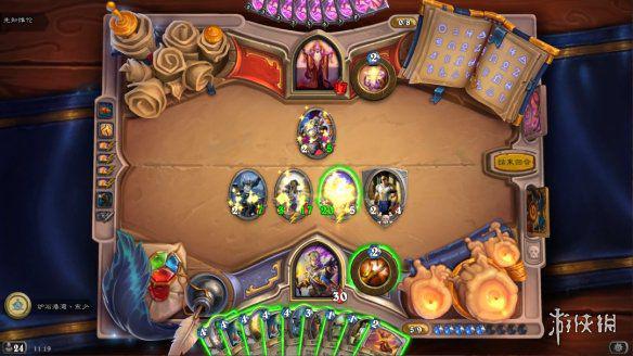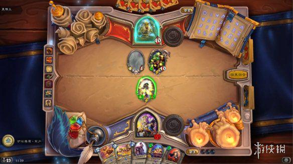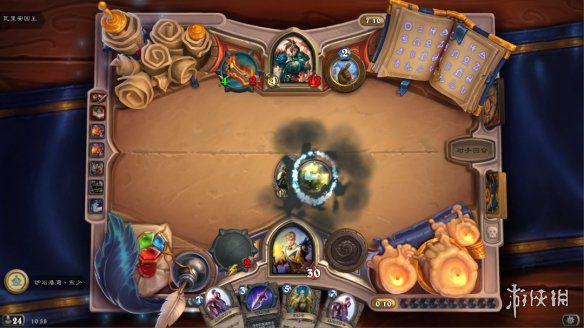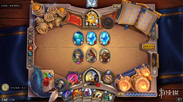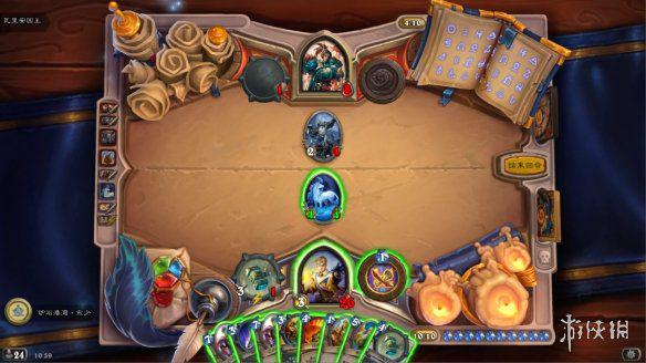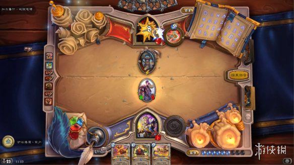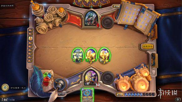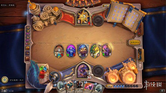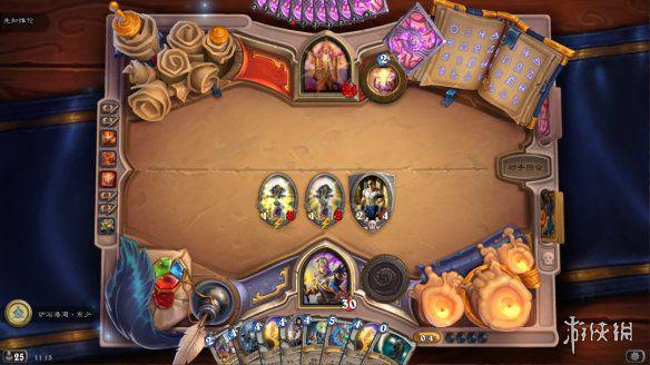 这个关卡前期场面压力不大,多铺场。我起手留下北郡和buff法术,多注意随从血量,避免被对面技能AOE带走。