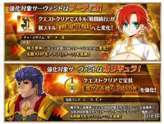 本次活动还将开启布狄卡和卡里古拉的强化本,布狄卡是技能得到强化,技能冷却时间缩短,战续效果变成单体赋予并且追加最大HP提升,鬼舅则是宝具进行强化,追加一个防御力提升3回合的效果。