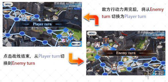在圣杯战线中,分为己方可以在地图上行动的“Player turn”和敌方可以在地图上行动的“Enemy turn”。