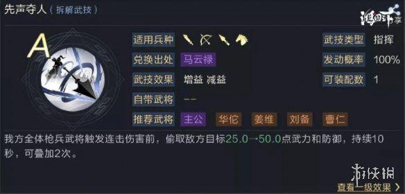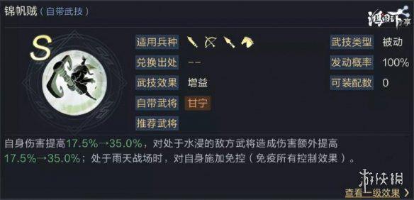 2号武技推荐先声夺人,偷取属性的效果能让甘宁获得不错的武力、防御提升。被偷取属性的敌方也会受到更多伤害,配合甘宁自身的输出能力,能够做到快速单点击破。