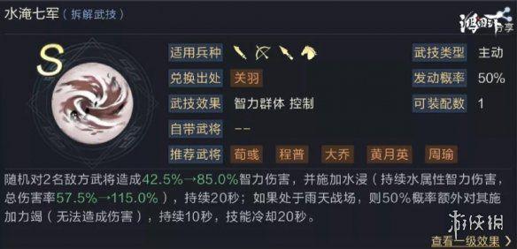 1号武技推荐水淹七军,该武技拥有不错的智力伤害率,最主要的是可为目标施加长达20秒的水浸效果。在雨天时还可额外施加力竭效果,兼备伤害、状态施加与控制。