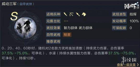 甘宁自带武技能让其天然拥有35%的伤害加成,并对处于水浸的敌人额外造成35%的伤害,雨天具备免控效果。虽然甘宁的主将技在雨天可以稳定为对方施加水浸状态,但考虑敌方净化、长时间战斗等因素,与甘宁搭配效果最好的武将仍然是程普。