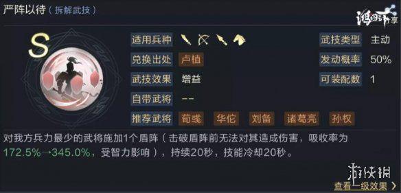 2号武技推荐严阵以待,可为己方兵力最低的武将提供一个高额盾阵。这个水鬼队的武将搭配不适合带恢复武类技能,而黄盖作为队伍主要承伤人员,在经历长时间作战后战损会比较高,严阵以待的高额吸收率可以弥补程普本身智力属性上的不足,为队伍提供保护。