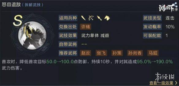 1号武技推荐怒目退敌,可在触发时降低目标防御并造成伤害。在雨天时甘宁自身的伤害加成非常高,像贯颐奋戟这类增伤连击技能的需求并不是太大。而减防能够在防御基数上削弱敌方的承伤能力,变相的加强甘宁伤害,实际收益会比直接提升伤害实用的多。