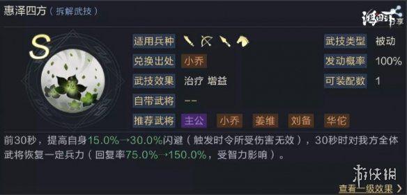 1号武技推荐惠泽四方,该武技可让黄盖在前30秒提高自身30%的闪避,并在之后为全体恢复一次兵力。稳定的闪避效果能让黄盖有概率规避掉敌方开局的爆发,变相的降低战损。