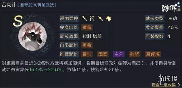 最后一名武将选择黄盖,虽然甘宁伤害充足,程普的增益效果也足够多,但武将本身的坦度较低,队伍缺乏稳定的前排和保护。而黄盖自身的属性非常适合充当队伍的前排,自带武技的嘲讽效果也可以很好的保护队友不被连击队站位针对(当然选择周泰携带嘲讽技能也是一种选择)。