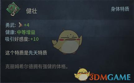 《十字军之王3》中的先天特质是很多的,不过体质增益类就比较少了,很多玩家都不太清楚健壮先天特质的具体效果是什么,今天小编就给大家带来玩家“分解大师史达林”分享的健壮先天特质效果的介绍,一起来看看吧。