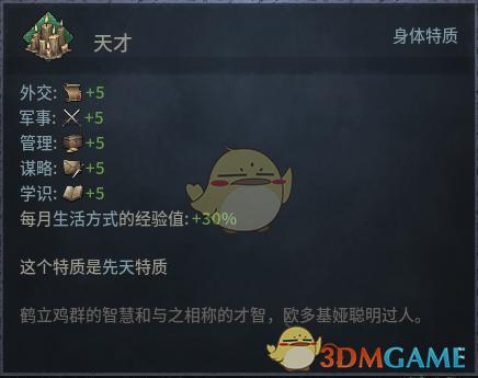 《十字军之王3》中的先天特质天才是非常好用的,有了这个特质在前期开局能轻松很多,但是很多玩家都不太清楚这个先天特质的具体效果是什么,今天小编就给大家带来玩家“分解大师史达林”分享的天才先天特质效果,一起来看看吧。