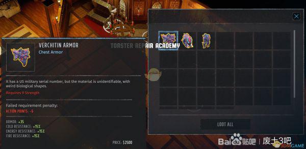 护甲是里面的保险箱开出来的,不知道是不是必出,我想应该是(因为一次一套,不太像是随机),要求开锁技能10级,所以如果技能等级不够,可以以后再来拿。