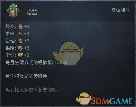 《十字军之王3》中的先天特质聪慧是非常好用的,很多玩家都不太清楚聪慧先天特质的具体效果是什么,今天小编就给大家带来玩家“分解大师史达林”分享的聪慧先天特质效果的介绍,希望能对大家有所帮助。