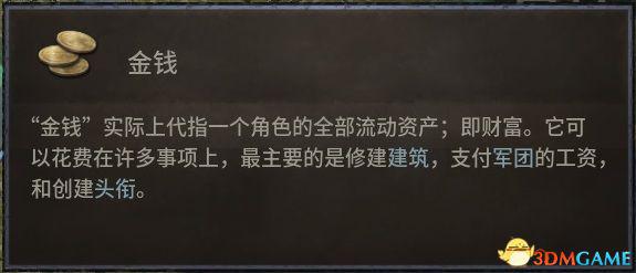 金钱通过税收获取,可以用来修建、雇佣、赠礼、贿赂。