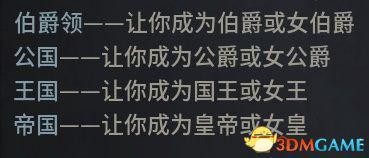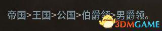 游戏中头衔级别由高到低为帝国→王国→公国→伯爵→男爵。