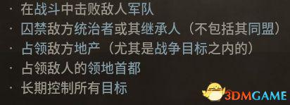 完成这些条件需要不同的战争分数,主要获得方式有4种,占领主要目标,战斗,占领次要目标,俘虏。