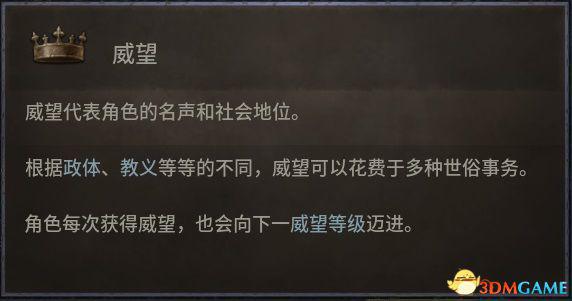 威望代表角色名声和社会地位,通过持有头衔来随时间持续获得。