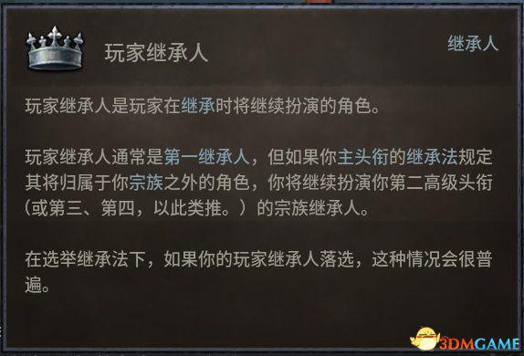 在我们控制的角色死后,我们将继续以玩家继承人的方式进行游戏,在领地页面的继承分支中,就可以查看继承人将会继承的头衔。