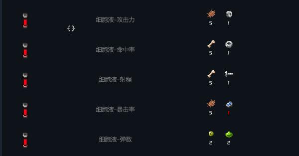 目前你可以通过细胞液强化武器的八种属性——分别是攻击力、暴击率、暴击伤害、射程、命中率、弹数、轮次和攻击速度。