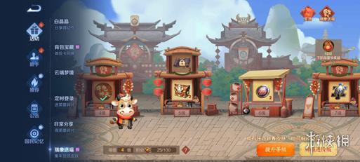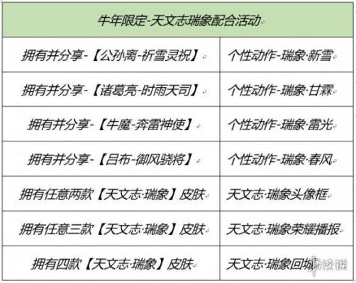 活动期间,通过登录游戏、参与对局等活跃即可获得活动积分;每100积分可以提升1级,通过任务每日最多获得200积分。每级都有免费年货奖励,小牛提升等级之后,会前进获取对应奖励,部分等级还有额外的进阶奖励,拥有任意【天文志·瑞象】皮肤,即可解锁进阶版。