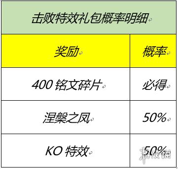 击败特效礼包:打开后必得400铭文碎片,可额外随机获得永久击败特效:涅槃之凤、KO特效其中之一。(每个特效仅可获得一次,重复特效将转化为90钻石)