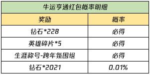有团就有聚,开年开好局。登录游戏即可领取拜年大礼:牛运亨通头像框*1+牛运亨通红包*1(限时生涯称号*1+保底288钻石+英雄碎片*5,有机会开出2021钻石)+荣耀积分*90+牛运亨通局内特效体验礼*1