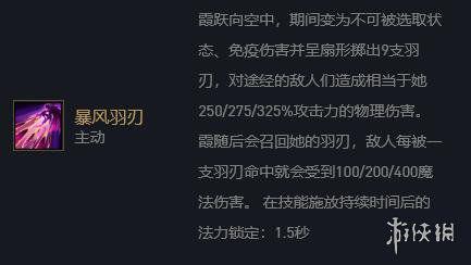 霞启动技能后变成无敌状态,并且释放羽毛造成AOE伤害,在启动一段时间后会再召回羽毛对敌人造成二次伤害。