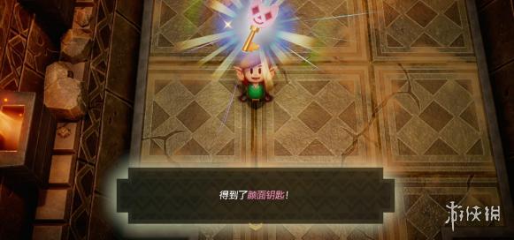 神殿内的盾牌 BOSS 砸地的时候,林克跳起来就不会被震到,在这时跳到他背后可以直接攻击,可以逐渐打破他的盾、护甲,击败 BOSS 可以获得颜面钥匙。再往里走,用魔法粉点燃火堆,可以阅读里面的壁画。