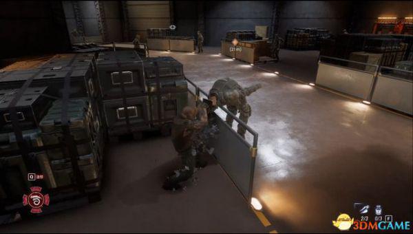 回到最初的位置,在集装箱后面吸引前面的一名敌人并解决。