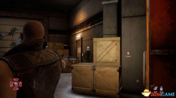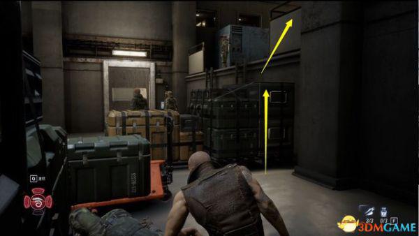 再次将出口处的敌人暗杀之后,从右边的箱子上去,刚好能避开敌人的视线。