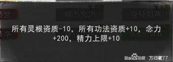 《鬼谷八荒》中的先天气运六根清净是非常全面好用的,在前期可以发挥的效果非常大,首先是效果所有灵根资质-10,所有功法资质+10,念力+200,精力上限+10,虽然减了灵根资质但是有钱什么灵根果还是很好弄的,更多如下。