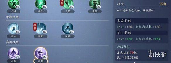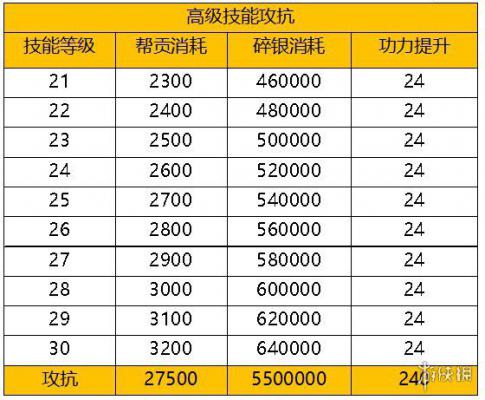 79级可以将高级技能中的攻抗提升到30级,此举将带来60攻击和75的双抗提升。预计消耗27500帮贡和550W碎银,具体消耗如下图: