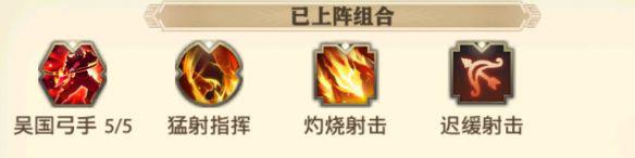 以上上阵武将黄忠、孙尚香、小乔、太史慈、甘宁、张星彩、黄舞蝶、步练师以及军师周瑜。这套阵容激活组合—吴国弓手、猛射指挥、灼烧射击、迟缓射击