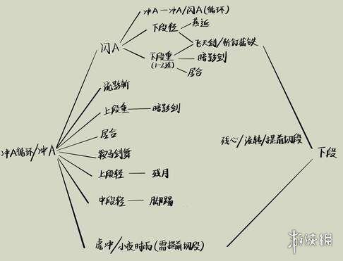 面对妖怪敌人可以参考,以冲a为起手的各种派生招式,当然根据情况也可以选择直接以第二列招式起手,具体情况具体分析。