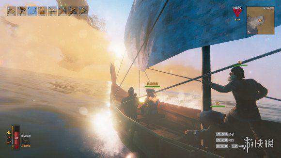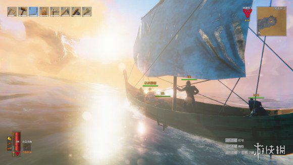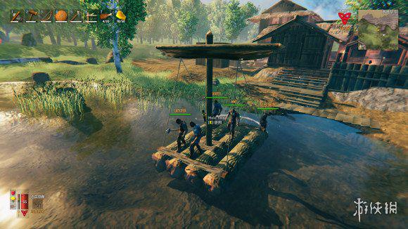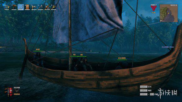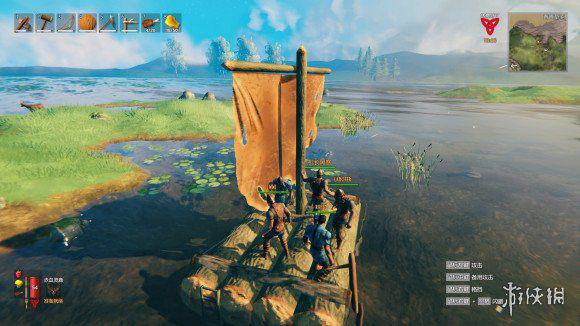 开了好久总算看到新大陆,船上的人兴奋地跟猴子一样直接跳海在大陆上狂跳,然后在沼泽边缘选了一个大石头建立前线基地,大家开始分分出门砍树,森林里开始出现有伤害的怪,这时候不能再无情单人砍树了,要一起出门才对付得了这些怪物,一个人拉货,一个人押镖。大家积攒资源,努力建立2本前线基地。