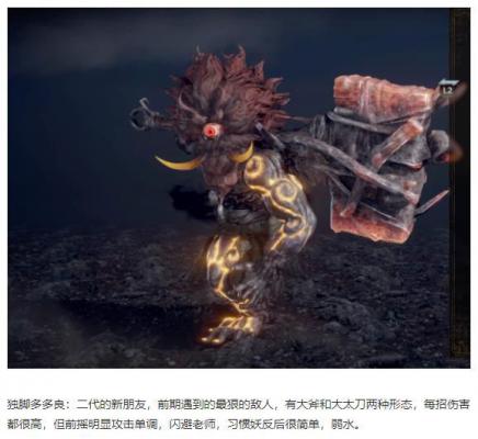 独脚多多良:二代的新朋友,前期遇到的最狠的敌人,有大斧和大太刀两种形态,每招伤害都很高,但前摇明显攻击单调,闪避老师,习惯妖反后很简单,弱水。