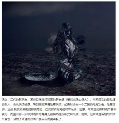 听到嘶嘶声请注意头顶,起身时会有一个二段的甩尾攻击,注意防御,近战投技和麻射线都很危险,红光招式有尾砸和麻光线;注意,常暗里的麻射线节奏会变化,而且会有一招极其诡异的背身无前徭颈椎折断式麻光线,弱雷,但雷减速后她的招式会变慢,习惯了普通的攻击节秦后反而更难躲了。