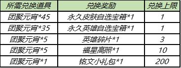 参与幸福安康活动收集团聚元宵,可免费兑换永久皮肤自选宝箱、永久英雄自选宝箱、英雄碎片、福星高照等奖励。