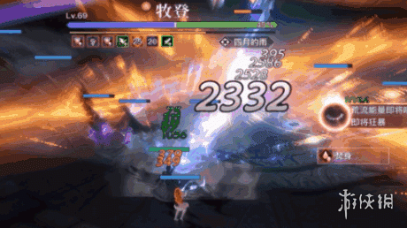 牧登释放【荒流喷射】时,会跃到场景中心,腾空而起,以自己为中心向周围发出会旋转的火焰射线,伤害很高,需要玩家在火焰间隙中跟着移动。