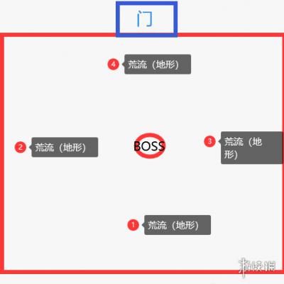 根据图示,因为第一波地形荒流是在地图后方,所以圣堂要从正面去开怪,其余队友在侧边输出。在等第一波地形荒流结束,圣堂跑到右边即可,以此类推,跑到反向处规避地形荒流,尽量把BOSS限制在场地中央即可。