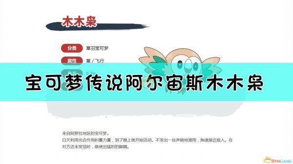 《宝可梦传说:阿尔宙斯》中的木木枭属于草羽宝可梦,所以这是一种草系与飞行系的宝可梦。这种宝可梦来自阿罗拉地区。在白天的时候不会活动,晚上才会出来,白天在光合作用,用来积攒力量。相当有意思的设定。
