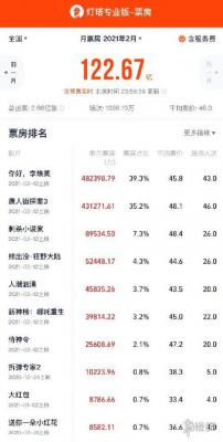 2021年2月单月内地票房共计122.67亿,创下全球单月票房记录新高!春节档电影票房占比超95%。