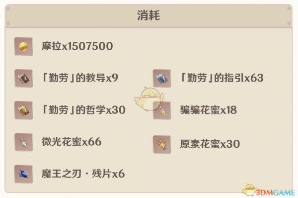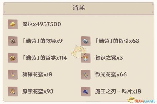 胡桃的天赋突破材料需要如下几种:勤劳的教导系列材料书、骗骗花蜜系列、以及打公子掉的魔王之刃残片。如果所有天赋都8级的话,那么一共需要消耗150万摩拉。如果要升全天赋10级,那么要495万摩拉。所需的材料具体数量可在下方查看。